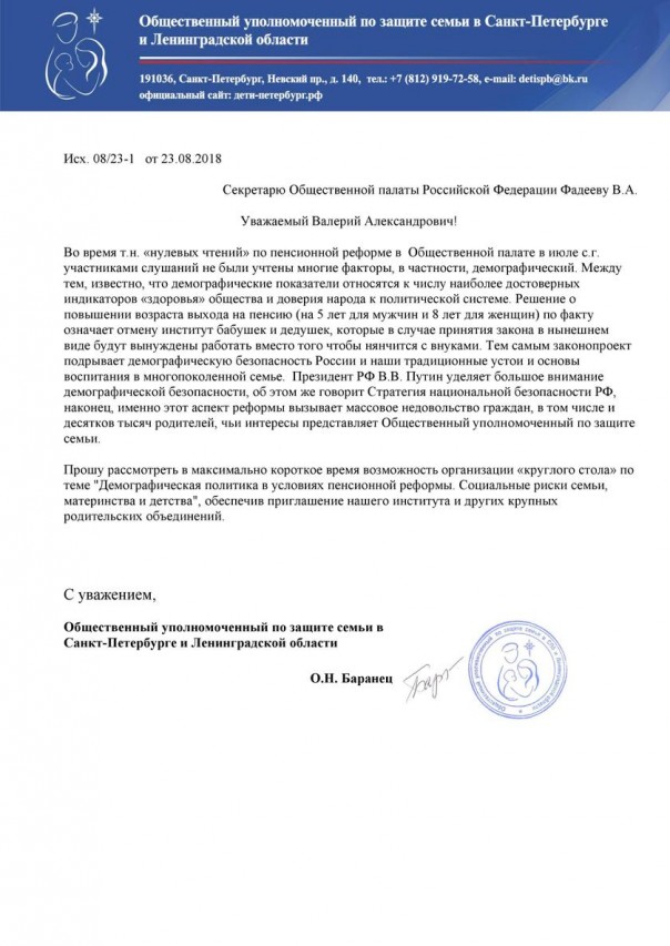 Что ж, Валерию Александровичу можно пожелать продолжать действовать в том же духе. Аппарат Общественного уполномоченного по защите семьи направил ему письмо с просьбой организовать круглый стол или общественные слушания по пенсионной реформе в контексте демографической безопасности.