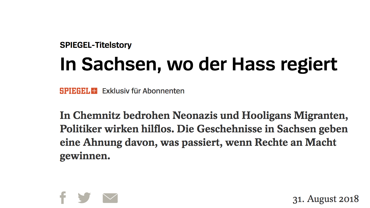 «В Хемнице неонацисты и хулиганы угрожают мигрантам, политики выглядят беспомощными. События в Саксонии дают представление о том, что происходит, когда правые добиваются власти», — сказано в статье.