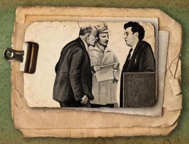 Владимир Ильич Ленин беседует с Николаем Ивановичем Бухариным и Григорием Евсеевичем Зиновьевым (слева направо)