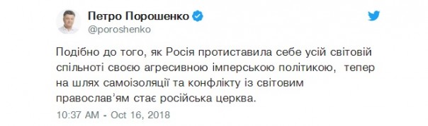 Решение Священного синода Русской православной церкви прокомментировал президент Украины Пётр Порошенко.