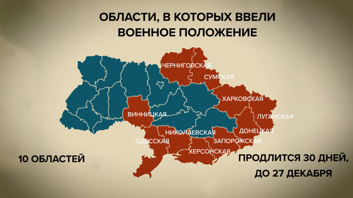 В итоге, вечером 26 ноября Верховная Рада поддержала введение военного положения в ряде областей и внутренних водах Азово-Керченской акватории. Военное положение было введено в 10 областях. Это – Винницкая, Одесская, Николаевская, Херсонская, Запорожская, Донецкая, Луганская, Харьковская, Сумская и Черниговская, сроком на 30 суток до 9:00 27 декабря.