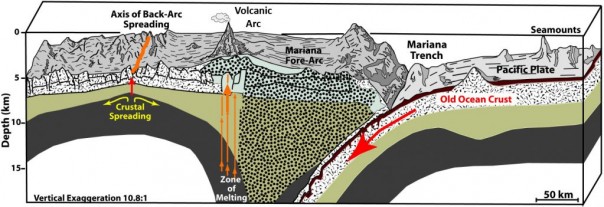 Толщина каждой плиты составляет почти 100 км, а глубина разлома — по меньшей мере 700 км от самой нижней точки бездны Челленджера. «Это айсберг. Человек даже не был на вершине — 11 ничто по сравнению с 700, скрывающимися на глубине. Марианская траншея — это граница между пределами человеческих знаний и реальностью, которая недоступна человеку», — рассказывает геофизик Роберт Стерн из Техасского университета.