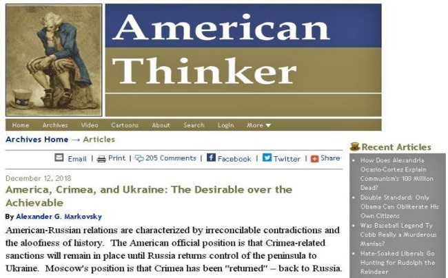 Для урегулирования украинского кризиса и нормализации отношений между Россией и США Марковский предлагает Западу признать российский статус Крыма и согласиться с независимостью востока Украины. В таком случае все стороны, по его мнению, останутся довольны. «Вильсоновские (Томас Вудро Вильсон – президент США в 1913-1921 гг. – Ред.) принципы национального самоопределения должны применяться к Крыму и востоку Украины так же, как они применялись к Югославии, Чехословакии, Шотландии, Фолклендским островам и Кипру», – заявляет автор статьи в American Thinker. Сторонники жёсткой враждебной линии в отношении России, по его мнению, утратили связь с реальностью.