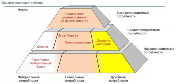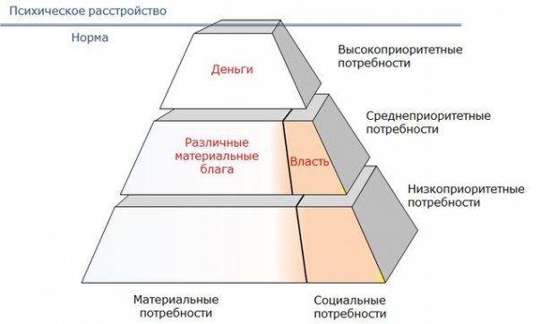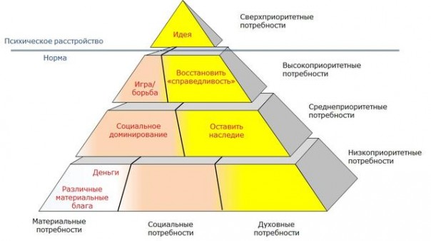 Иерархия потребностей тесно связана с системой ценностей человека и не важно, что первично, важно, что сложность обеих систем опосредуется развитием социальной и духовных сфер. Если последние отсутствуют или слабо выражены, то все что такому человеку необходимо, можно купить за деньги. Потребности и ценности такого человека становятся как у наркомана или алкоголика – все очень примитивно и сводится к одному пункту.