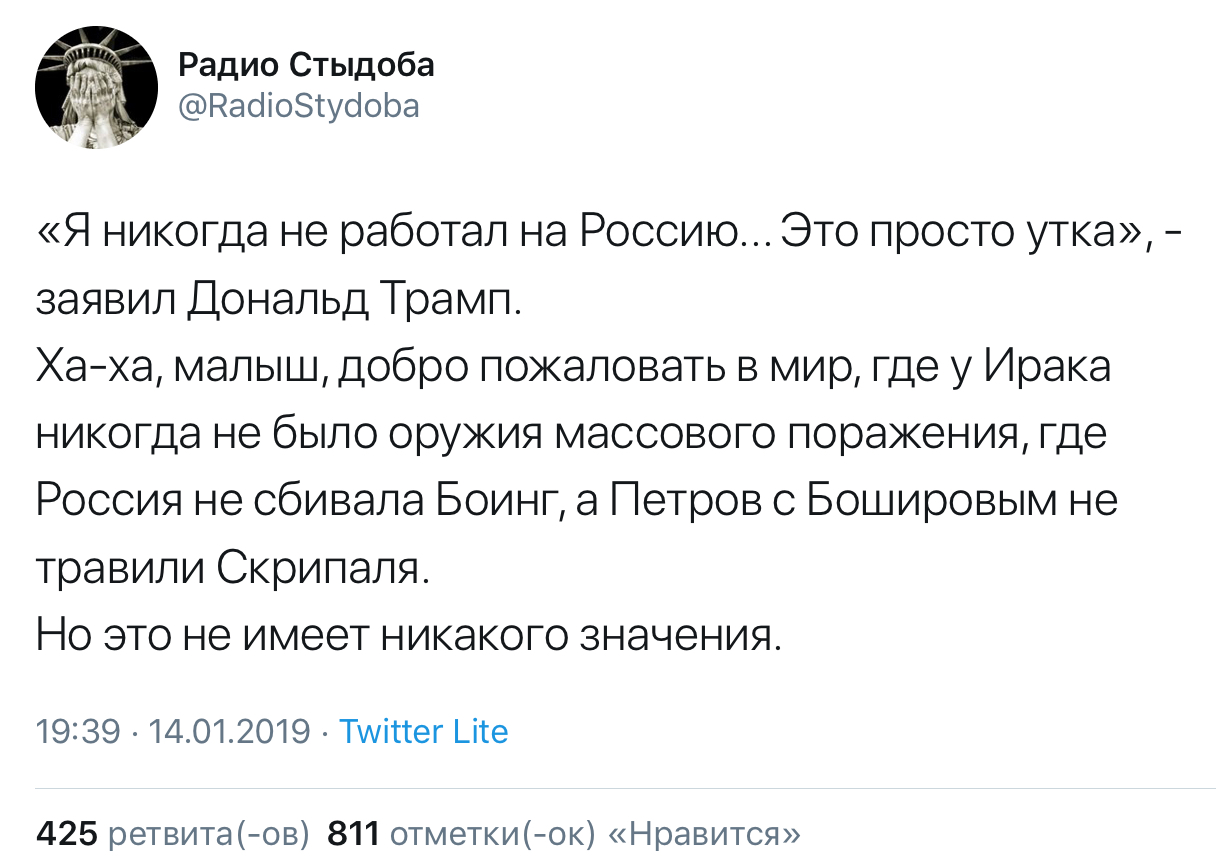 Кстати, это самая простая и, как выяснилось, самая эффективная схема. Тут я за оппонентов Трампа могу только порадоваться. Вложенные в демонизацию России и русофобию средства окупились сторицей.