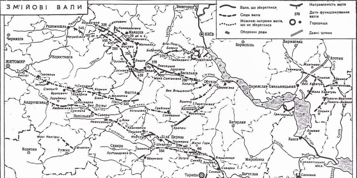 Впрочем, более поздняя передатировка основания Киева — аргумент в пользу позднего создания Змиевых валов Поднепровья. Ведь по своей конфигурации, по крайней мере на Правобережье, они прикрывают именно Киев.