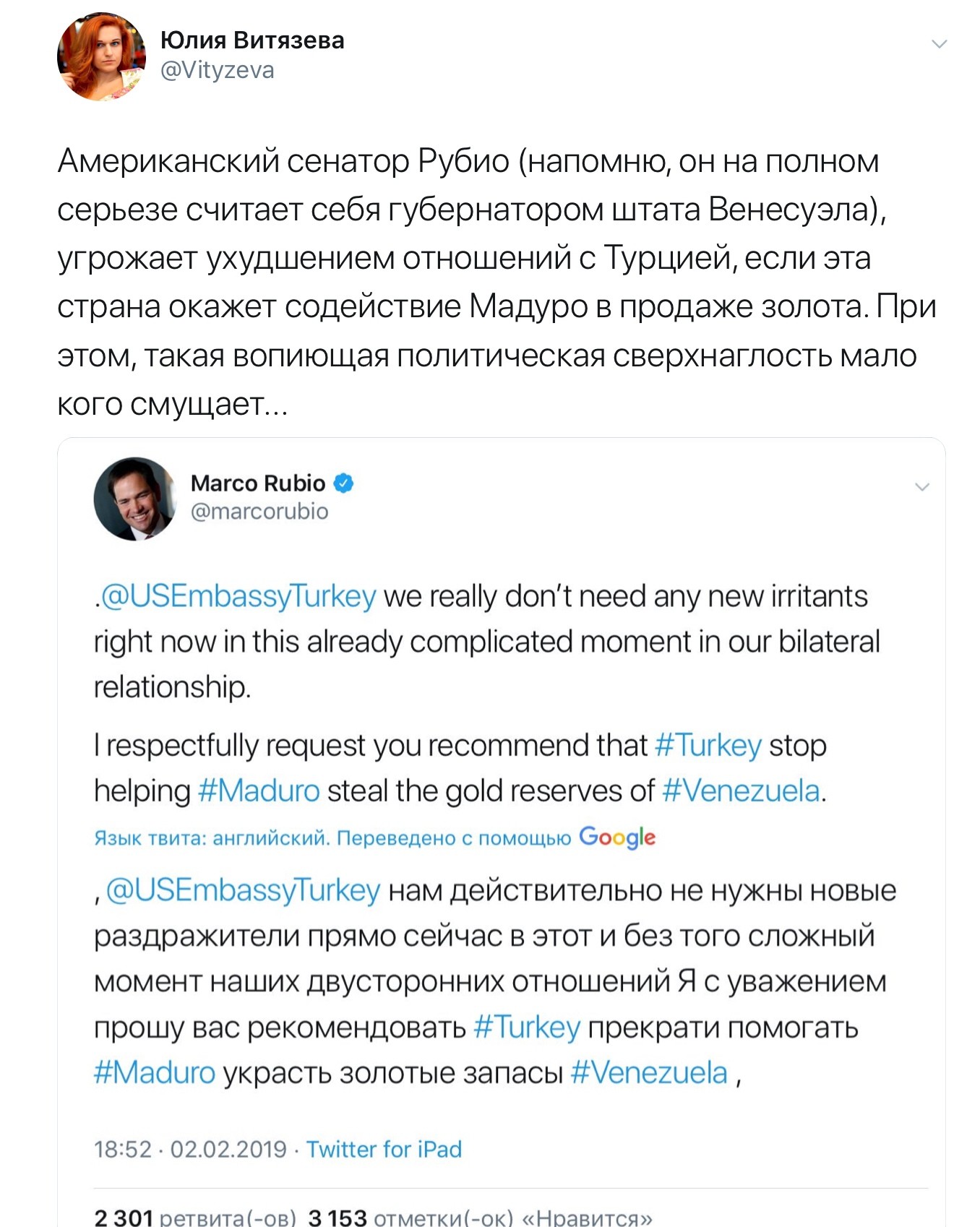 Сегодня виновен тот, на кого укажут США. И не нужны никакие следствия, доказательства и суды. Сегодня не нужны выборы. Добросовестная конкуренция, благодаря санкциям, тоже уходи в историю. Теряют актуальность и договора, потому что США оставляет за собой право исключительно по собственному желанию их разрывать.