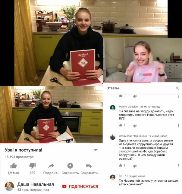 "Если послушать девочку, история вырисовывается складная, почти мимимишная. Активный блогер, сетевая активность, обратили внимание… Всего этого ей якобы хватило, чтобы поступить «на бесплатно». Даша показала финансовые документы, фиксирующие, что доходы её родителей ниже определённого минимума, так что учиться она будет бесплатно, за счёт гранта. Ей также положена стипендия, покрывающая питание и проживание. О том, сколько раз и в какие страны Алексей Навальный возил свою семью в последнее время «в отпуск», семейство, очевидно, умолчало", - замечает Федеральное агентство новостей.