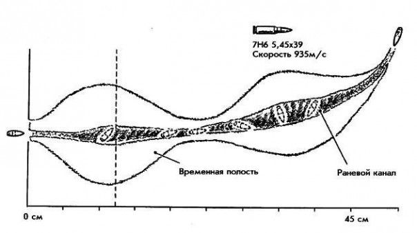 В-третьих, применительно к пулям патрона 7Н6, смещение центра тяжести действительно влияет на поведение пули в тканях. При этом пуля начинает беспорядочно кувыркаться, а ее траектория по мере углубления в ткани отклоняется от прямой линии. Такое поведение пули заметно увеличивает травматический эффект при поражении небронированных живых целей.