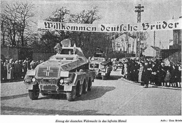 «Добро пожаловать, немецкие братья». Весной 1939 года нацистским войскам местными агентами немецкого влияния был организован тёплый приём
