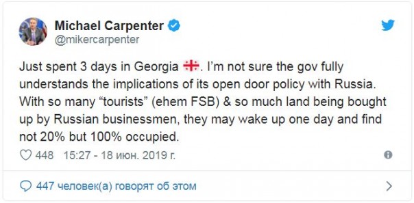 Противоборство конкурирующих группировок за контроль над глубоководными портами Грузии носит геополитический характер. Любые, даже самые осторожные шаги Тбилиси по выстраиванию диалога с Москвой вызывают в Вашингтоне нервозность. Это заметно по рассуждениям Карпентера об угрозе потери Грузией суверенитета и территорий из-за наплыва «российских туристов с погонами ФСБ».