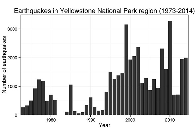 Число зарегистрированных землетрясений в Йеллоустоне за 1973-2014 годы