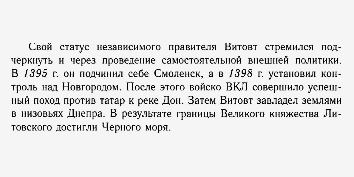 Такой узкий взгляд на историю, когда она рассматривается только в границах современной Белоруссии, проходит стержнем сквозь все белорусские учебники. Есть лишь одно исключение — Великое княжество Литовское. То есть, когда белорусские земли входят в состав Древнерусского государства, России или Советского Союза, эти государства рассматриваются как чужие и кратко изучаются в курсе всемирной истории. А вот история ВКЛ в учебниках рассматривается как своя — и изучается в деталях.