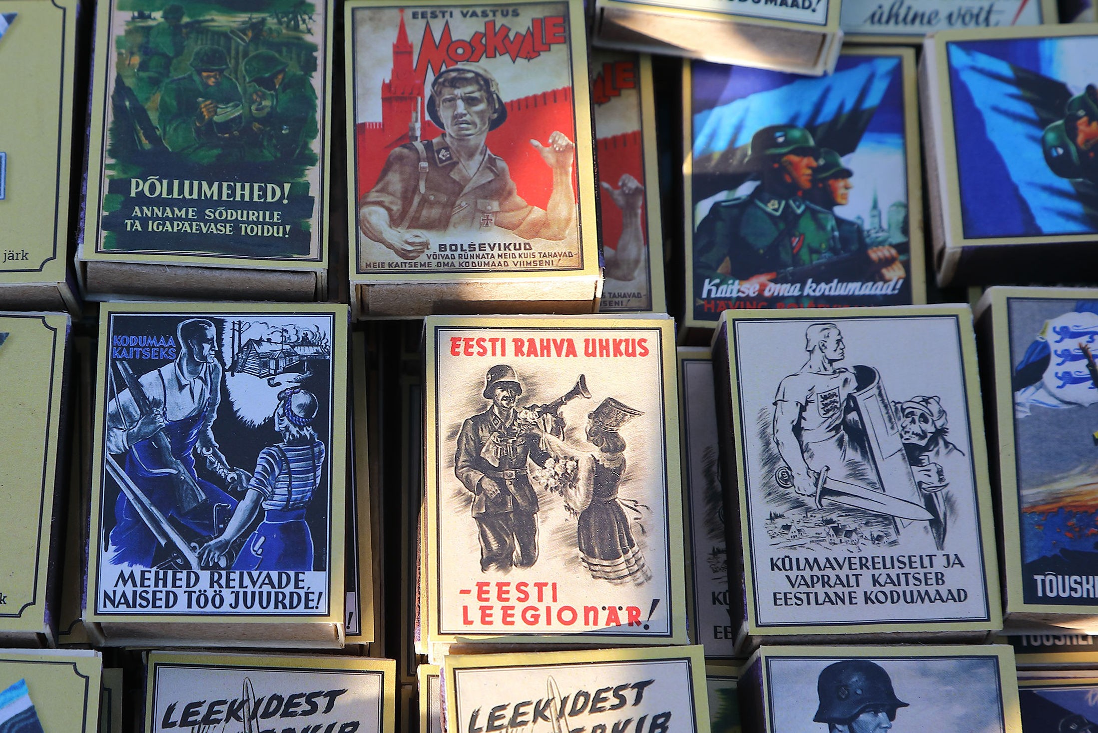 Продавец Линас рассказал Sputnik Латвия, что специально привез их из своей лавки в Таллине, где они каждый день продаются. На этикетках в основном были нацистские агитки о вступлении в эстонский легион CC, о том, как надо бить большевиков, причем уже на их земле, например в Москве. Рядом с этими спичками продавались и магнитики на холодильник - с копиями тех же агитационных плакатов. Стоили по 2 евро за штуку. Обычная цена.