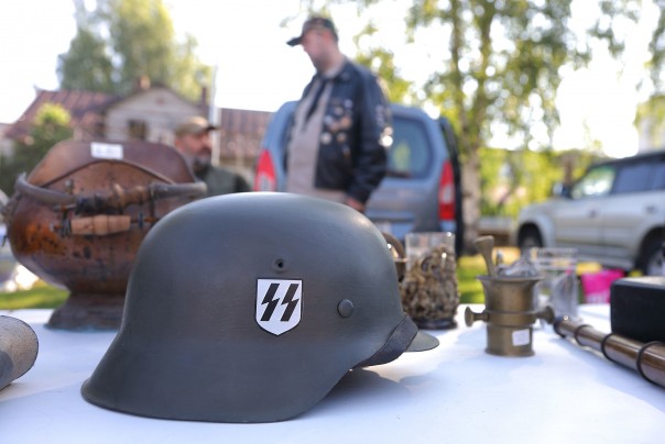 "Я эти плакаты ламинировал. Повесишь дома - долго будут хорошо смотреться", - рекламировал товар торговец Арво в шапочке гитлеровского пехотинца. Рядом с ним стоял, судя по всему, его сын, от головы до пят в аутентичной форме: какие-то элементы ее были явный новодел, другие - военного времени.