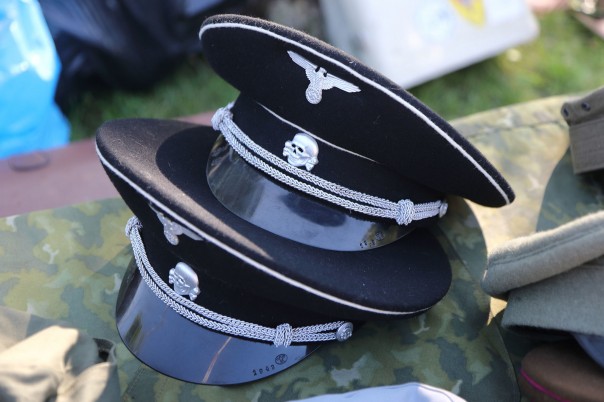 На соседнем столике продавали пластинки времен Второй мировой - с германскими маршами. Около них лежали каска с эмблемой СС и красные нарукавные повязки с черной свастикой в белом кругу, а также фуражки со знаком "мертвая голова". Такая фуражка стоила 20 евро.