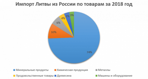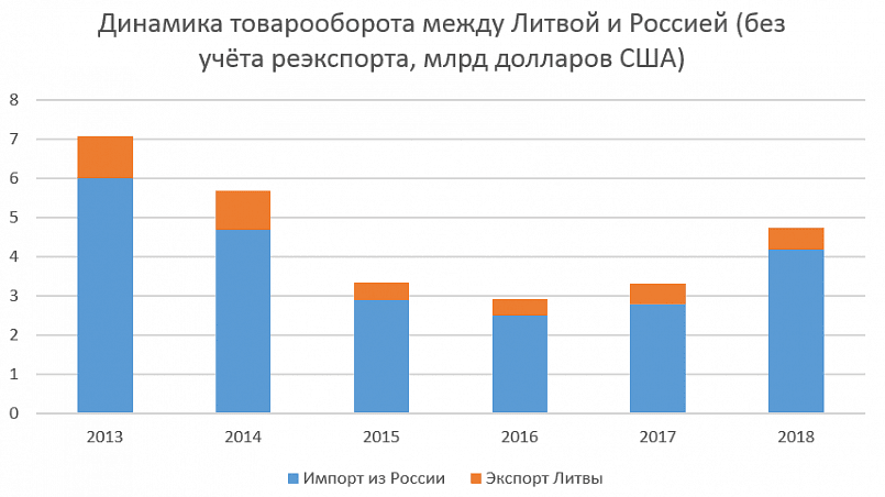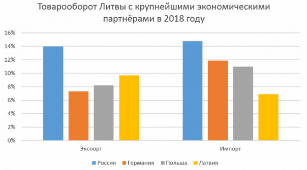 Кроме того, сохраняется и региональная экономическая взаимозависимость России и Литвы, которая сформировалась еще в период существования Советского Союза. По сей день Россия занимает первое место у Литвы по объему экспорта и импорта. В 2018 году экспорт Литвы в Россию составил 14% от общего объема и, по сравнению с 2017 годом, увеличился на 1,4% — до 3,974 млрд евро. Импорт страны из России обеспечил 14,8% общего объема и составил 4,58 млрд евро.