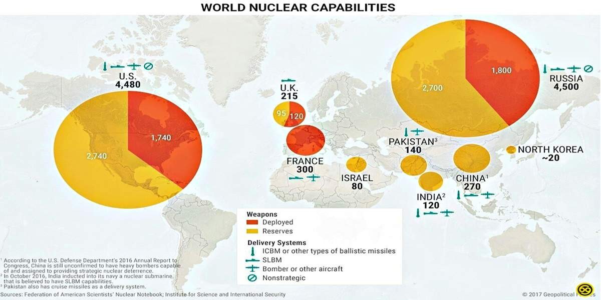 И это мы поговорили о схеме с двумя сторонами. Сейчас в «ядерном клубе» состоят восемь держав плюс Израиль, у которого бомбы официально нет, но если что — он не побоится её применить. При этом три державы обладают потенциалом взаимного уничтожения. И ещё немало стран, которые, хотя и не имеют ядерного оружия, но могут создать его в самые короткие сроки, если потребуется (например, Япония).