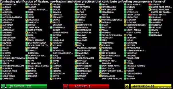 Генеральная Ассамблея ООН большинством голосов приняла резолюцию по борьбе с героизацией нацизма и неонацизмом, предложенную Россией. Против выступили Украина и США, за проголосовало 121 государство, 55 стран от голосования воздержалось.
