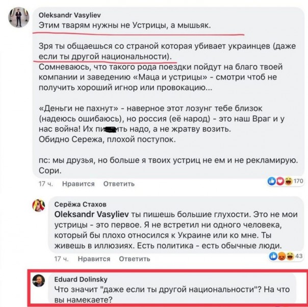 Итак, киевский ресторатор, владелец заведения «Маца и устрицы» посмел приехать в Москву. Более того, в День памяти жертв Голодомора он не постыдился запостить на своей странице фото с устричной фермы в Москве.