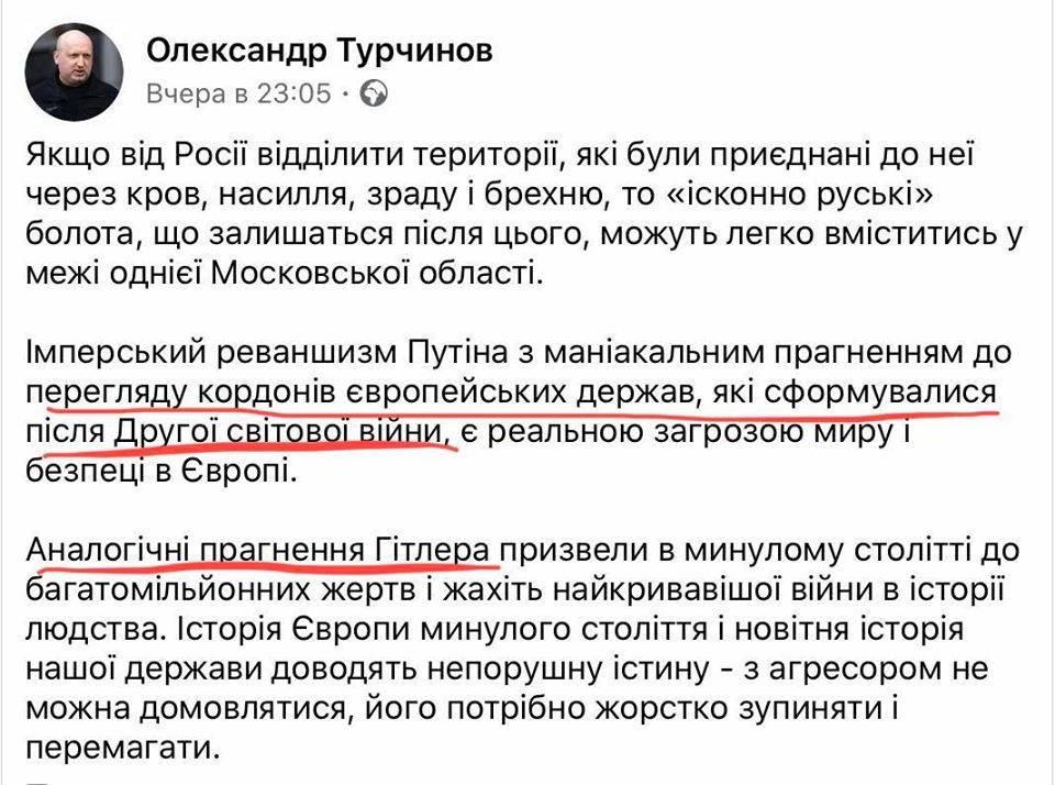 Турчинова возбудили слова российского лидера о русских землях, которые советская власть передала Украине «странноватым решением». В этой связи он сообщил о своих видениях русских земель с размером в Московскую область. Вместе с этим Турчинов поспешил заявить, что Владимир Путин планирует пересмотреть границы европейских стран, которые сложились после Второй мировой войны и сравнил стремления Путина со стремлениями Гитлера.