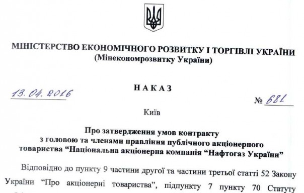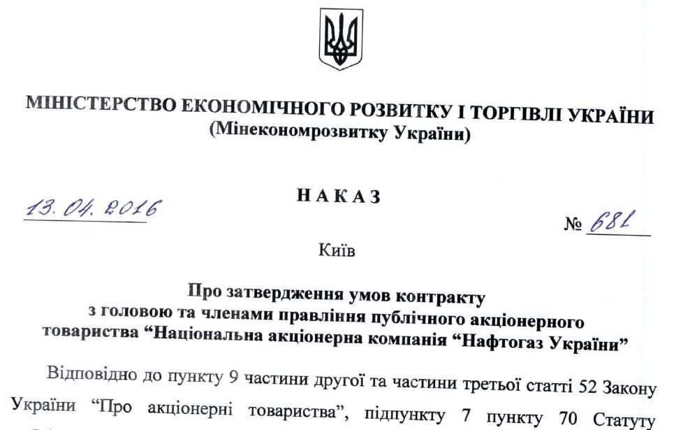 Как оказалось, оклад А. Коболева, подписанный ещё в марте 2016 года, составил 1,041 млн гривен (более 40 тысяч долларов). Также согласно документу, предусмотрена выплата ежемесячных премий и прочего вознаграждения, которые должны выплачиваться согласно коллективному договору. Об этом говорится в условиях контракта, утвержденных Министерством экономического развития и торговли приказом №681 от 13 апреля 2016.