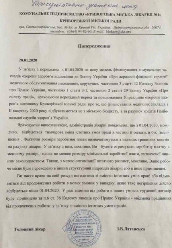 Во многих городах медики уже сегодня получают «письма счастья» от администрации, в которых говорится, что с 1 апреля зарплаты уменьшаются до минимальной, а тем, кто с этим не согласен, предлагают уволиться: «Согласно статье 32 КЗоТ Украины, работник имеет право на свое усмотрение согласиться с изменением существенных условий или отказаться от работы в новых условиях». Такие уведомления уже получили медработники в родном городе Зеленского – Кривом Роге, а также в Чернигове, Харькове и других населённых пунктах. Многие главврачи уже сейчас увольняют медсестёр и санитарок, сокращают койки и объединяют отделения, чтобы как-то сэкономить.