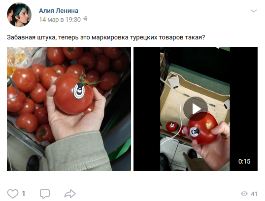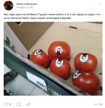В российских магазинах все чаще попадаются турецкие помидоры с наклейками «Спонсор мирового терроризма». Пользователи соцсетей вовсю развлекаются, выкладывая фотографии, снятые на камеры телефонов, а также строят догадки, кто бы это мог сделать.