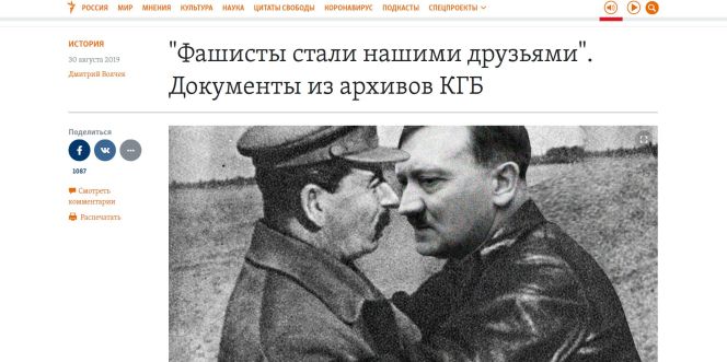 Иногда доходит до, внешне, форменного идиотизма. Вот, например рупор американского госдепа «Радио Свобода» докатился уже до того, что украсил очередной антисоветский и антироссийский пасквиль о «сговоре Гитлера и Сталина» откровенно примитивным фотомонтажем с явно ненатуральными объятиями все тех же персонажей. Зато под кричащим заголовком «Фашисты стали нашими друзьями. Документы из архивов КГБ».