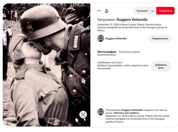 На фотографии, которая якобы сделана в сентябре 1939 года на якобы совместном немецко-советском военном параде в Бресте, которого на самом деле никогда не было, якобы немецкий солдат целует якобы женщину-военнослужащую Красной армии. В том, что это стопроцентная фальшивка может лично убедиться любой, кто вообще в состоянии отличить вторую мировую войну от, допустим, походов Ганнибала. Просто потому, что на этой даме погоны, которые в Красной армии были введены только в 1943 году, и которых в 1939-м, по этой причине, просто быть не могло.