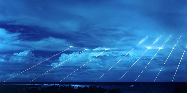 Оставляя за собой плазменный шлейф, разделяющиеся боеголовки входят в атмосферу и одновременно обрушиваются на десятки целей.
