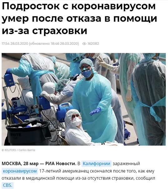 Система здравоохранения США уже не справляется со взрывообразным ростом числа заболевших. Она, откровенно говоря, никогда особой гуманностью не отличалась, именно поэтому без малого 30 миллионов американцев не имеют медицинской страховки, а рожениц через две недели после родов вынуждают выходить на работу. Здравоохранение в США, как, впрочем, и большинство сфер жизнедеятельности в Стране заходящего солнца ориентировано на максимальное выжимание денег из клиентов.