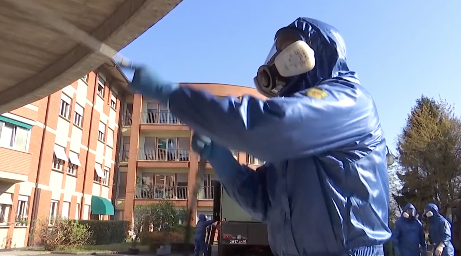 Российский военный специалист дезинфицирует пансионат для пожилых людей в Италии