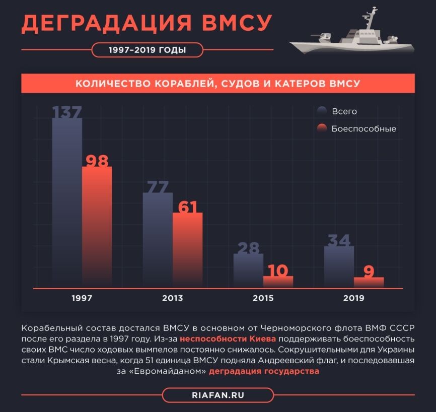 Период могущества украинских военно-морских сил давно миновал. Он был тогда, когда они базировались в Севастополе и когда им досталась часть Черноморского флота СССР, которую они очень быстро загубили и распродали на металлолом», — сказал в комментарии Федеральному агентству новостей Василий Дандыкин.