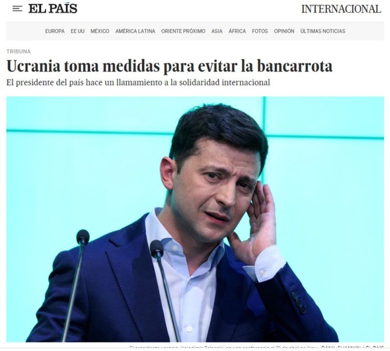 Испанская газета El Pais опубликовала крик о помощи президента Украины Владимира Зеленского, который внезапно осознал, что страна на грани экономической катастрофы и только от Запада зависит, наступит ли для нэзалэжной завтрашний день. Он призвал МВФ, Всемирный банк и Евросоюз «не рисковать жизнями миллионов украинцев», а прийти и спасти. То есть дать денег.