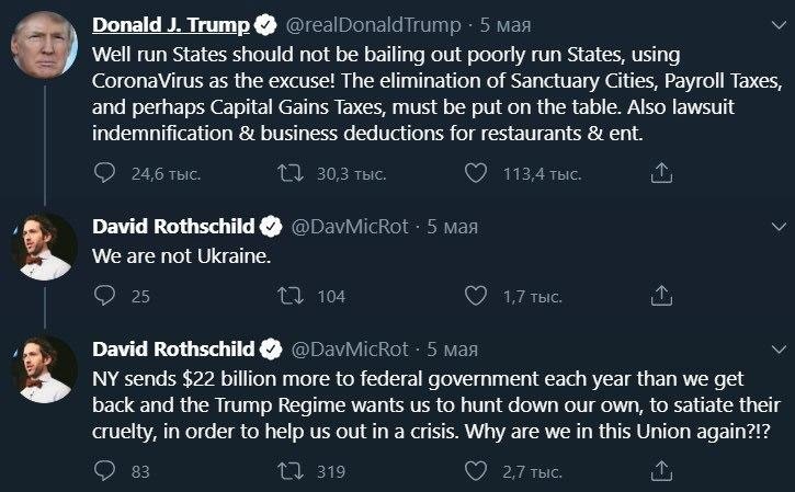 Ему ответил член известной династии банкиров Дэвид Ротшильд: «Мы — не Украина». И добавил, что штат Нью-Йорк, подконтрольный демократам, платит в федеральный бюджет больше, чем получает. Таким образом Ротшильд прозрачно намекнул, что Трамп не должен шантажировать бедные штаты предоставлением помощи так, как он это делал с Украиной.