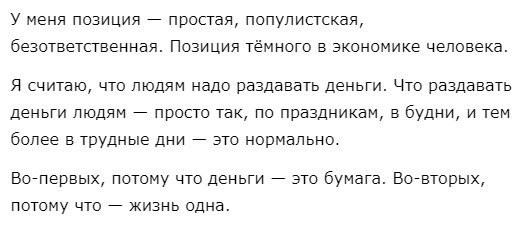 Как и не понимает разницу между "выделить из резервов" и "включить бешеный печатный станок". Прилепин ведь безответственный популист, не понимающий в экономике (это не мои слова, я его за язык не тянул и в НКВД с ним не играл).