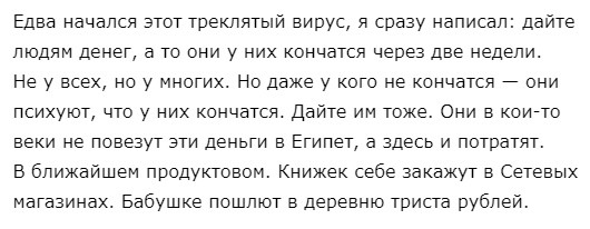 Он вообще не понимает разницу между "вертолётными деньгами", как предлагали Навальный, Платошкин и прочие популисты, и целевой адресной помощью.