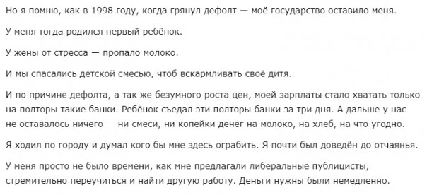 Я сидел в редакции издательства "Культура", где мне выделили стол, и писал. Потому что больше мне некуда приткнуться не было, я снимал кровать в хостеле за 700 рублей в сутки. И писал по 50 статей в месяц. А после обеда ехал в другое место, где ещё писал - в составе сводной аналитической группы по Донбассу мы разрабатывали проекты интеграции экономики Донбасса в российскую и другие аналогичные проекты помощи Новороссии.