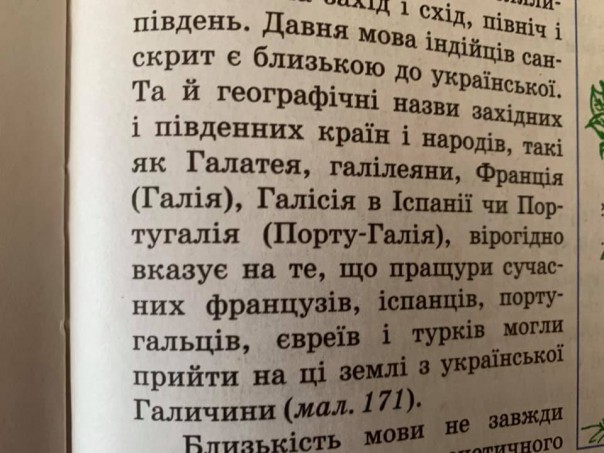 «Древний язык санскрит близок к украинскому. Также и географические названия западных и южных стран и народов, такие как Галатея, галилеяне, Франция (Галия), Галисия в Испании или Португалия (Порту-Галия), вероятно указывает на то, что предки современных французов, испанцев, португальцев, евреев и турков могли прийти на эти земли с украинской Галичины». (с) Эдуард Долинский https://www.facebook.com/eduard.dolinsky