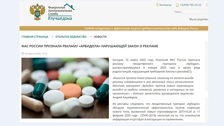 Материалы были переданы для возбуждения дела об административном правонарушении для назначения штрафа. Штраф – от 200 до 500 тысяч рублей. Для компании миллиардера Харитонина это деньги? Вопрос риторический. На титульной странице сайта arbidol.ru, несмотря на претензию ФАС, размещена реклама: "активен против вирусов гриппа и ОРВИ, в том числе коронавирусов". Федеральная антимонопольная служба, господин Артемьев, вам не кажется, что вас откровенно посылают?
