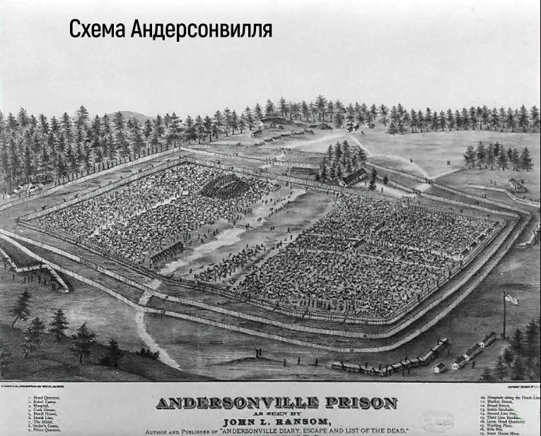 Этот лагерь южан называли адом на земле. Он начал "работать" в феврале 1864 года. В чистом поле была выделена и огорожена забором территория в 11 Га. Через лагерь прорыли два канала. Из одного канала заключенным предлагалось пить, а другой выполнял роль коллектора сточных вод. Понятно, что в таких условиях в Андерсонвилле царила невероятная антисанитария, заключенные массово умирали от тифа и малярии.