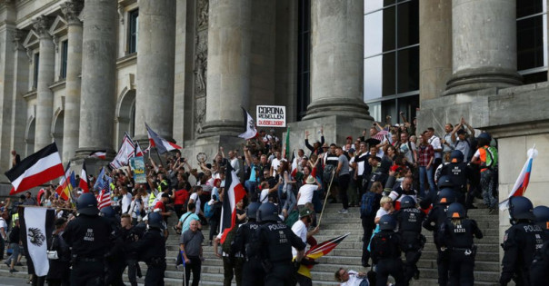 Группы правых радикалов стали закидывать полицейских бутылками и камнями. Часть манифестантов прорвали оцепление перед зданием Рейхстага и забрались на его лестницу, бросая в полицейских камни и бутылки. Полиция ответила слезоточивым газом. Пострадало несколько полицейских. Задержано около 300 человек.