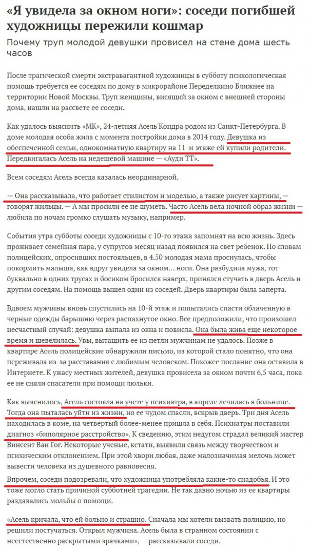 Да, родители у девушки были не бедные и обеспечили дочь хорошим и дорогим автомобилем, а также небольшой, но уютной квартирой на 11-этаже, одной московской новостройки. Почему Я заостряю внимание на этаже? А потому, что у девушки было ещё одно несомненное достоинство - проблемы с психикой. Ей даже был поставлен диагноз «биполярное расстройство», а ещё ранее у неё уже были попытки суицида.