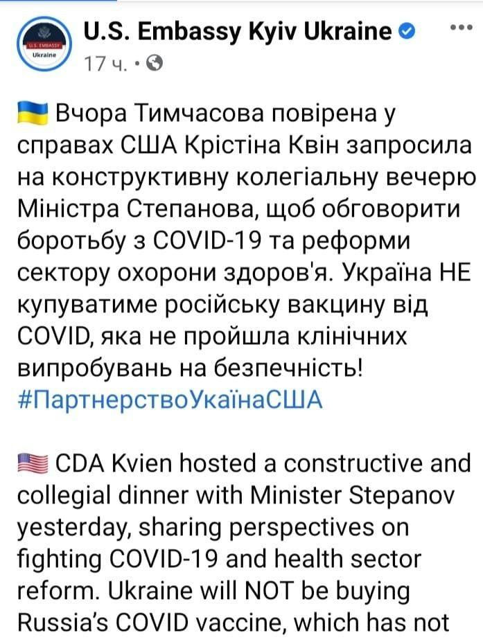 Ну а американское посольство для большей убедительности опубликовало на своей странице сообщение о том, что Украина НЕ будет покупать российскую вакцину. Слово «НЕ» выделили, чтобы все уж точно заметили и больше вопросов не задавали.