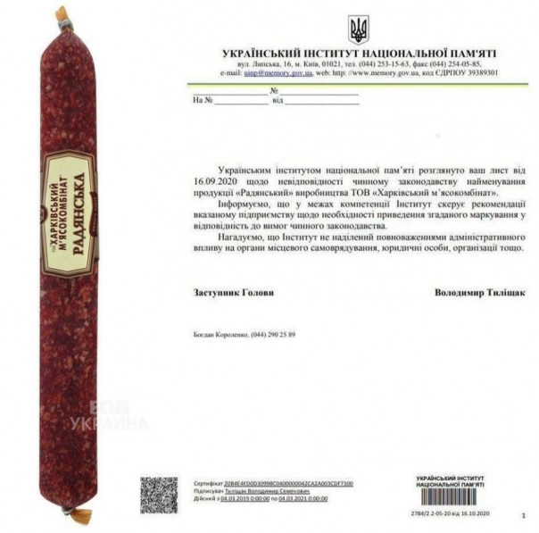 Когда колбаса и та оскорбляет… В Харькове местные активисты пожаловались в Украинский институт национальной памяти на… колбасу. По их мнению, колбаса Харьковского мясокомбината под названием «Радянська» («Советская») оскорбляет честь «свідомих» украинцев. Скорее всего, институт сам не ожидал подобного прецедента, но заверил активистов, что настоятельно порекомендует мясокомбинату придумать колбасе новое название.