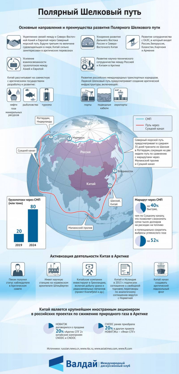 Хотя Китай считает себя «почти арктической державой», его самый северный порт Далянь находится в 5700 километрах от Северного полюса. Поэтому для реализации своей стратегии создания северного ответвления Великого Шелкового пути Китай покупает у РФ доступ к Арктике. Пекин старается укрепить партнерские отношения с нашей страной, чтобы закрепиться на Крайнем Севере.