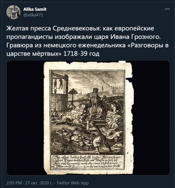 В "летучих листовках" – своего рода жёлтой прессе Средневековья – Иван Грозный изображался в карикатурном виде – диким зверем, окружённым телами замученных людей. Так поддерживался образ "варварства" русских, представляющих угрозу "цивилизованной" Европе