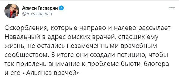 Сколько уже Навальный шишек набил, не отслеживая то, что он говорит, а всё никак не научится фильтровать свой базар. После того, как он облил грязью омских врачей в интервью немецкому Der Spiegel, медики составили петицию, чтобы привлечь его к ответственности. Об этом сообщил на своей странице в Twitter политолог Армен Гаспарян.