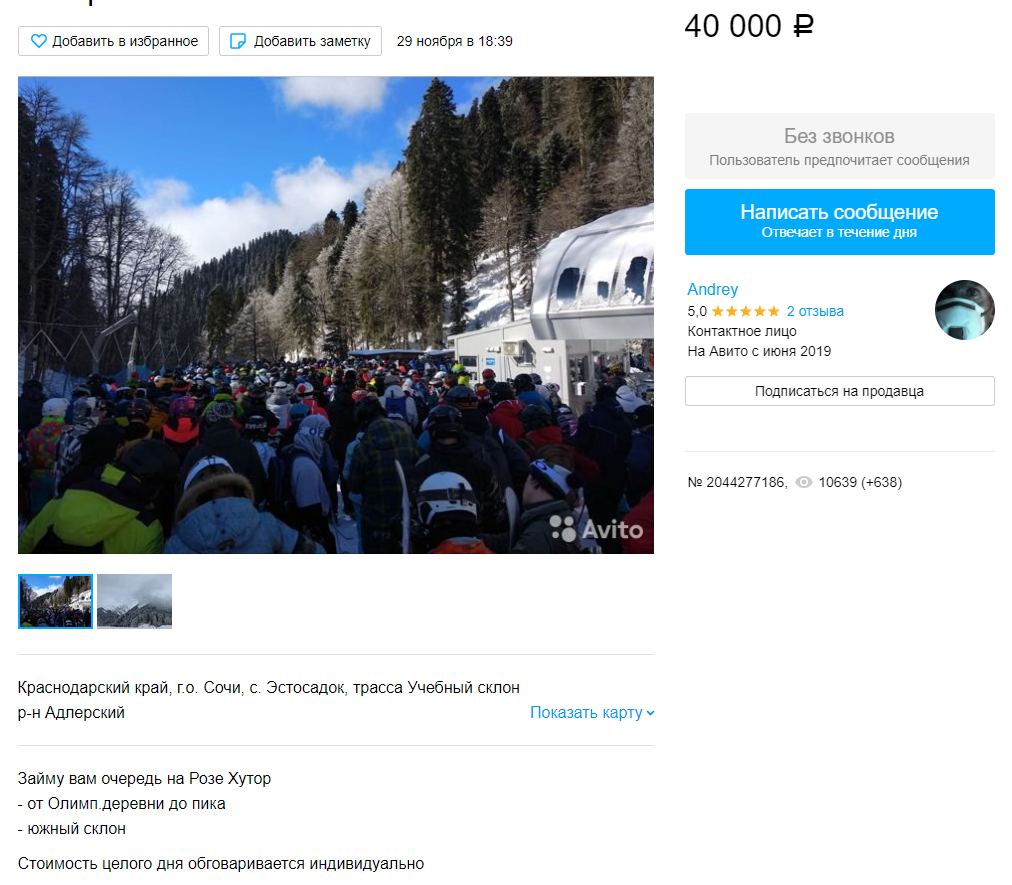 Но дело все в том, что того количества горнолыжных курортов, которые есть у нас в стране, их на всех не хватит. Предприимчивые жители Сочи придумали оригинальный бизнес, они стали предлагать места в очереди на подъемник на «Красной поляне»!